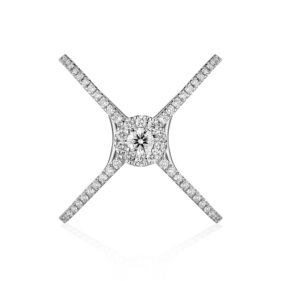 18kt gold Papillon cross design ring with a central diamond and two strands of brilliant cut diamonds.