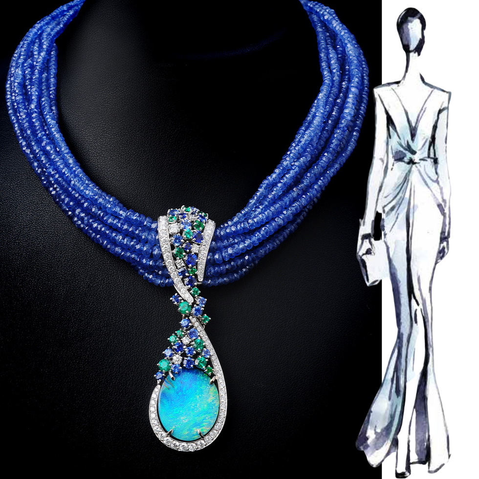 An extraordinary opal embraces the colors of the rainbow, accompanied by a small and elegant constellation of sapphires, emeralds and paraibas. A ribbon of white gold and brilliants closes the necklace and offers a playful touch signed Forever Unique.