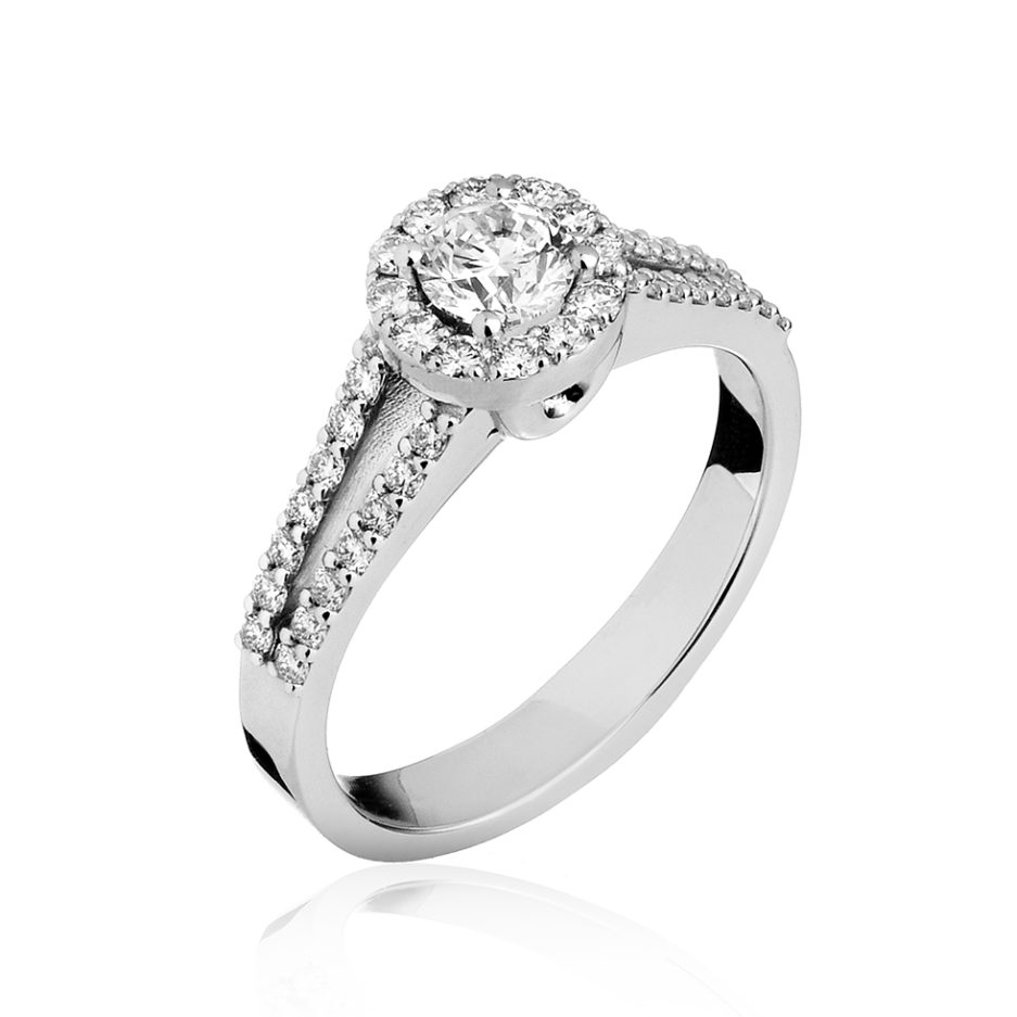 Prezioso solitario in oro bianco 18 carati con diamante centrale abbracciato da doppio gambo full pavé.