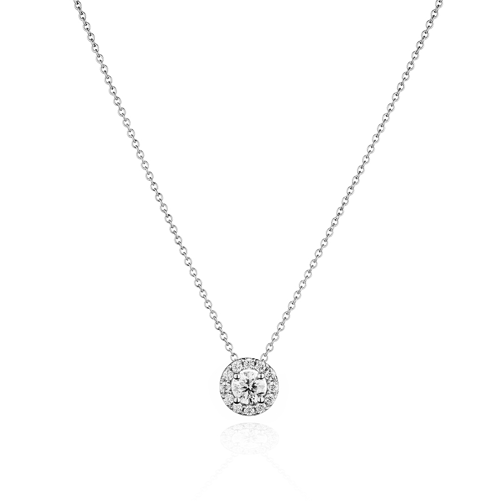18kt gold pendant in parure with the iconic solitaire Isabelle, with central diamonds and a diamonds’ setting.