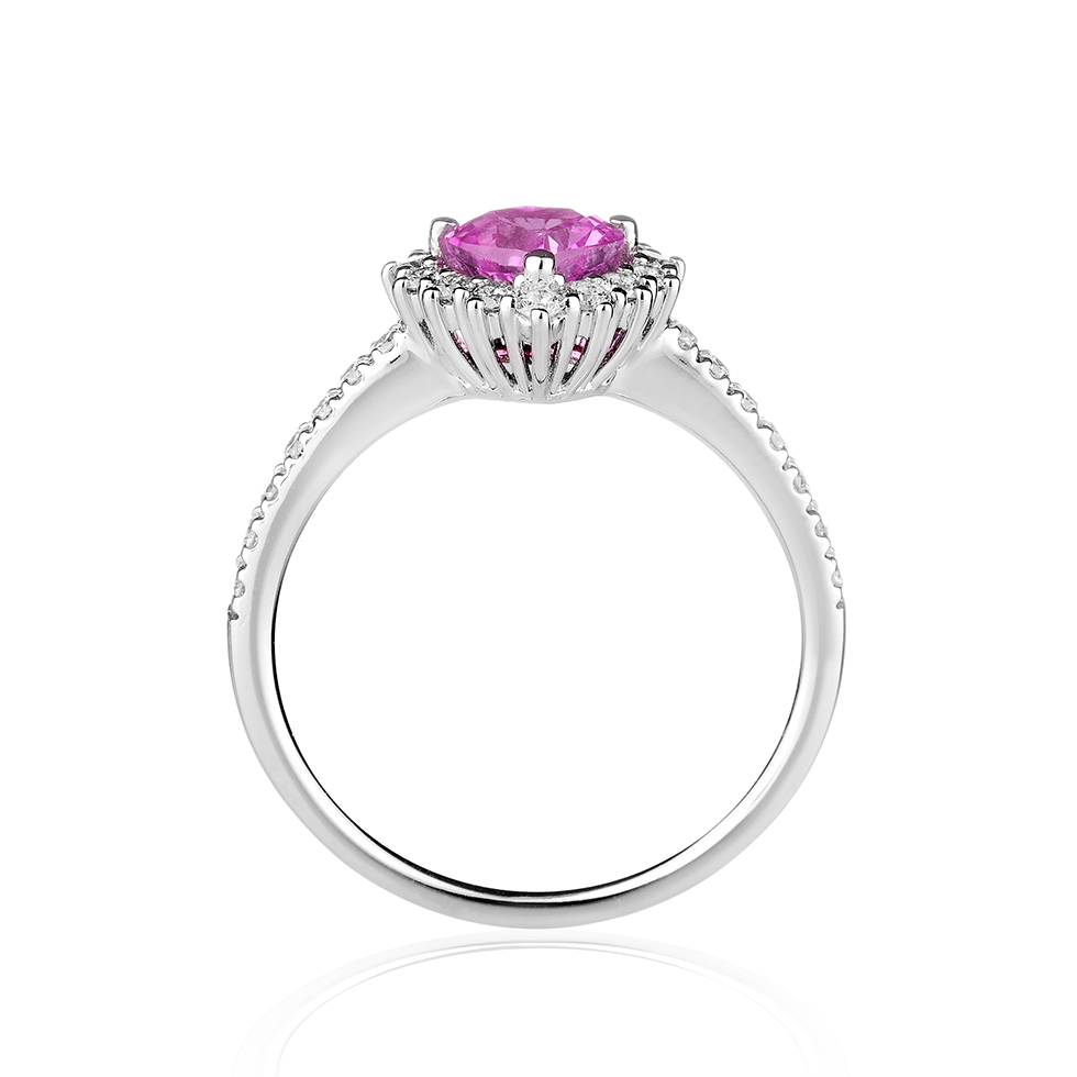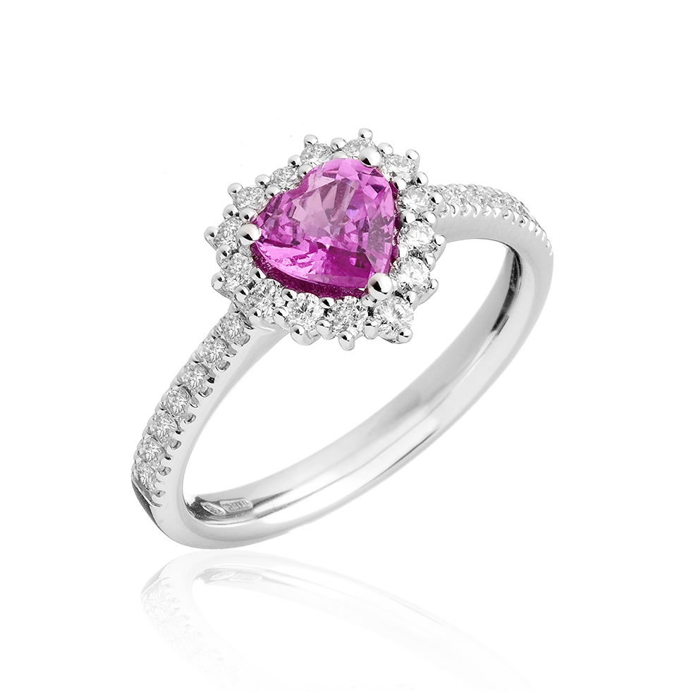 Magnificent 18kt white gold cluster ring with a central heart cut pink sapphire and diamonds’ surrounding.