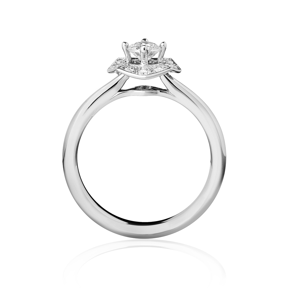 Una corona di piccoli diamanti avvolge con decisione il diamante centrale.