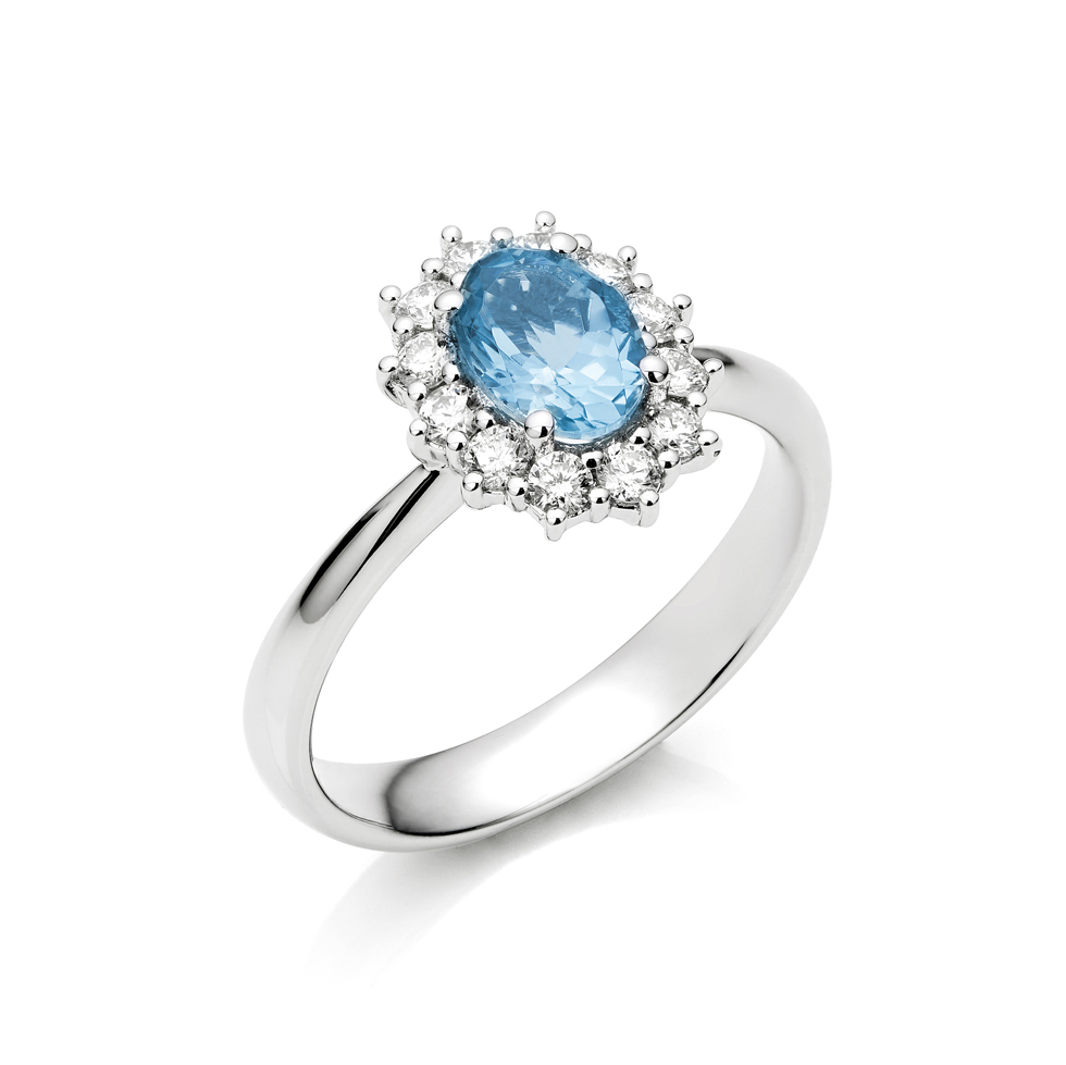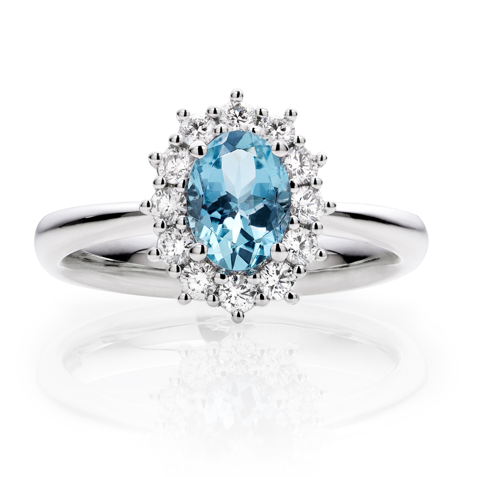 Anello cestino in oro bianco 18 carati con acquamarina centrale e contorno di diamanti.